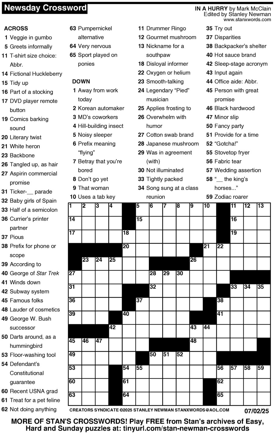 Newsday Crossword Puzzle For Jul 02 2025 By Stanley Newman Creators Syndicate