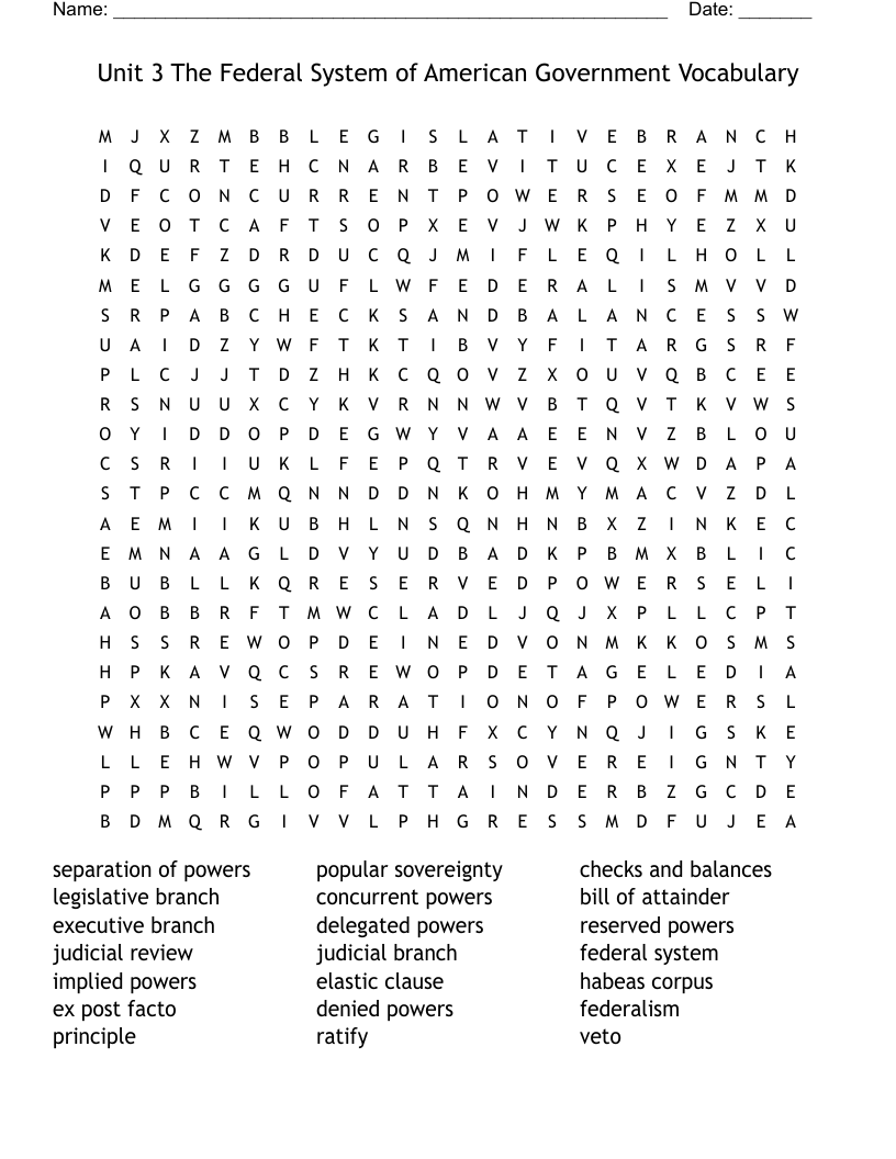 Unit 3 The Federal System Of American Government Vocabulary Word Search WordMint