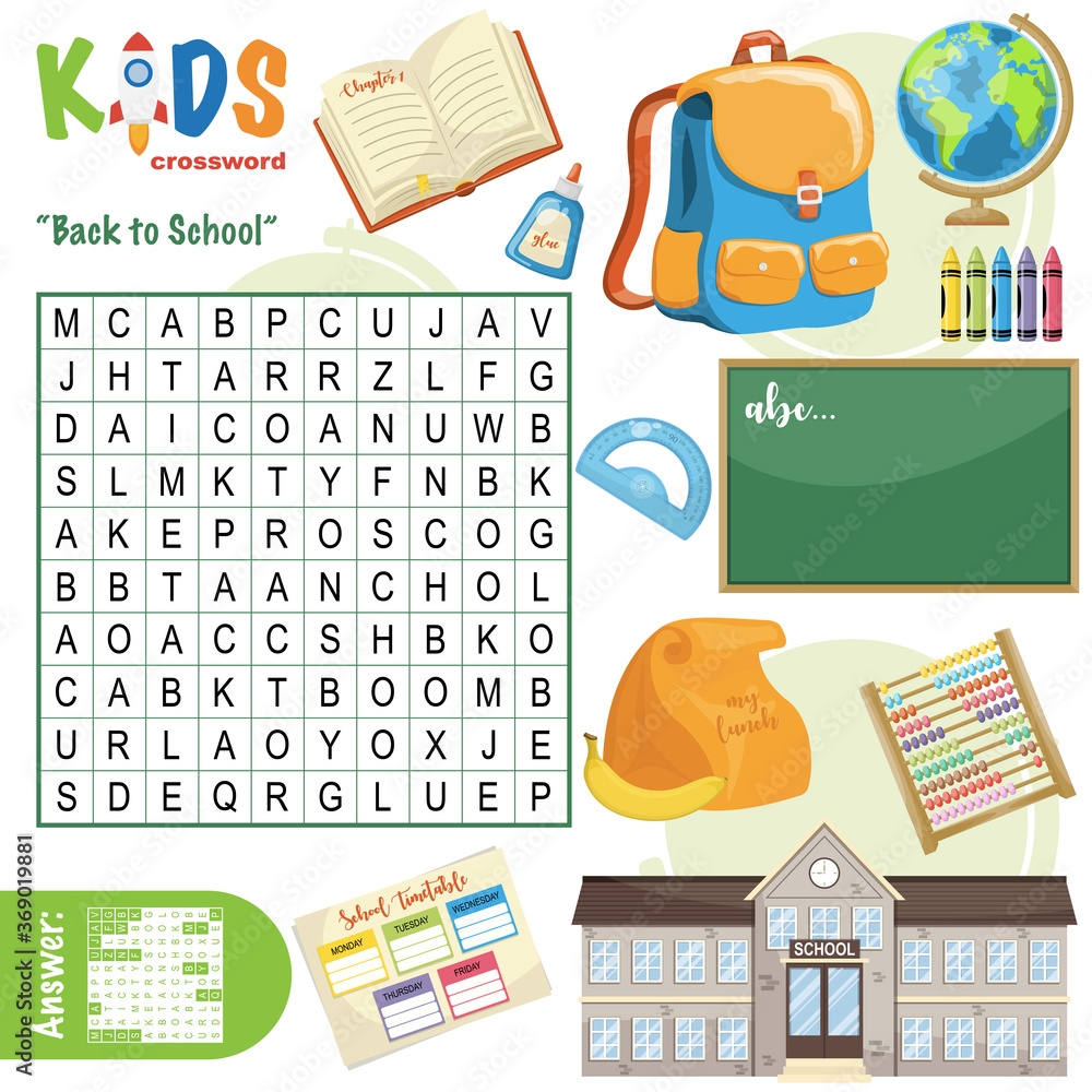 Easy Word Search Crossword Puzzle Back To School For Children In Elementary And Middle School Fun Way To Practice Language Comprehension And Expand Vocabulary Includes Answers Stock Vector Adobe Stock