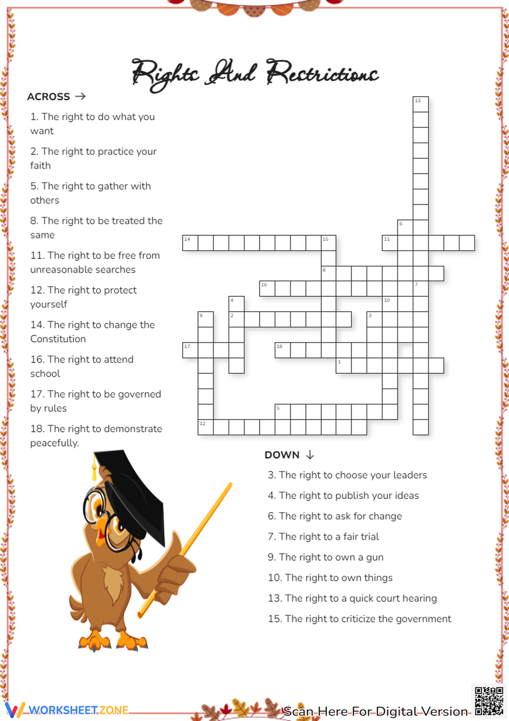 With clues related to freedom of speech, religion, and the right to bear arms, this crossword will challenge your understanding of these important rights. Whether you’re a student studying civics or just a history buff, this printable is sure to entertain and educate.