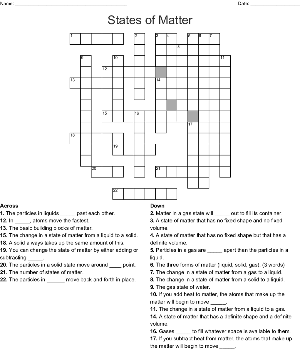 Free Printable States Of Matter Crossword Puzzles