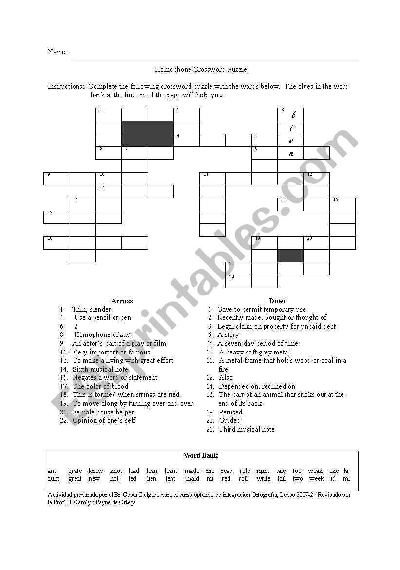 Homophone Crossword Puzzle ESL Worksheet By Bcarolyn interlink ve
