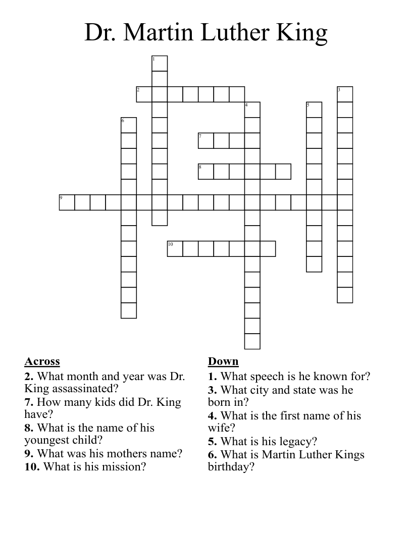 This crossword puzzle features clues related to Dr. King’s early life, activism, and achievements. From the Montgomery Bus Boycott to the March on Washington, each clue provides insight into his remarkable journey. Challenge yourself to solve the puzzle and discover fascinating facts about this inspiring individual.